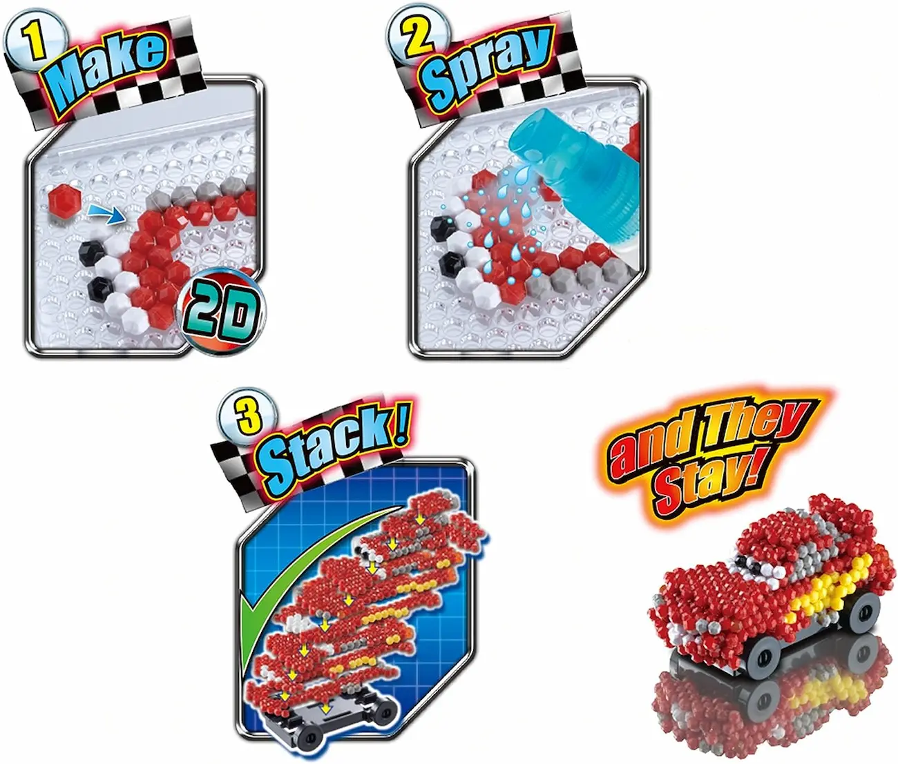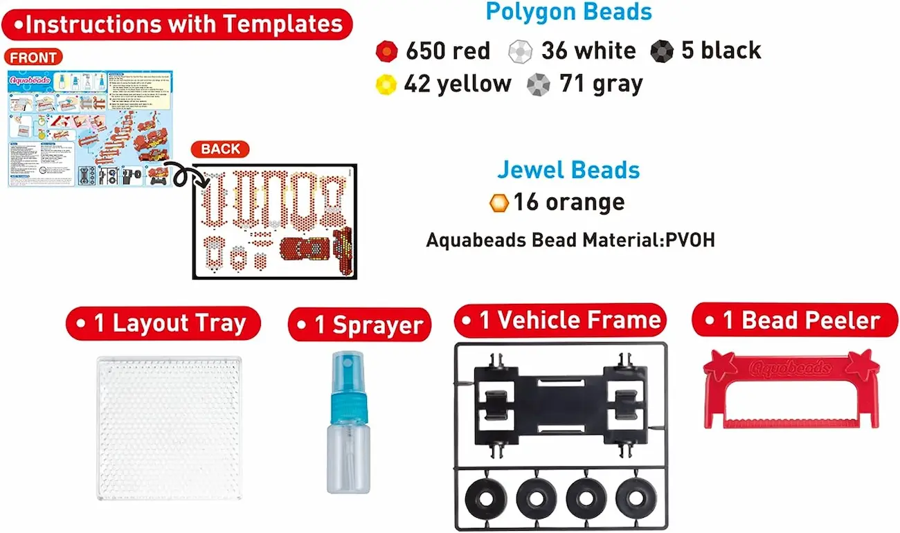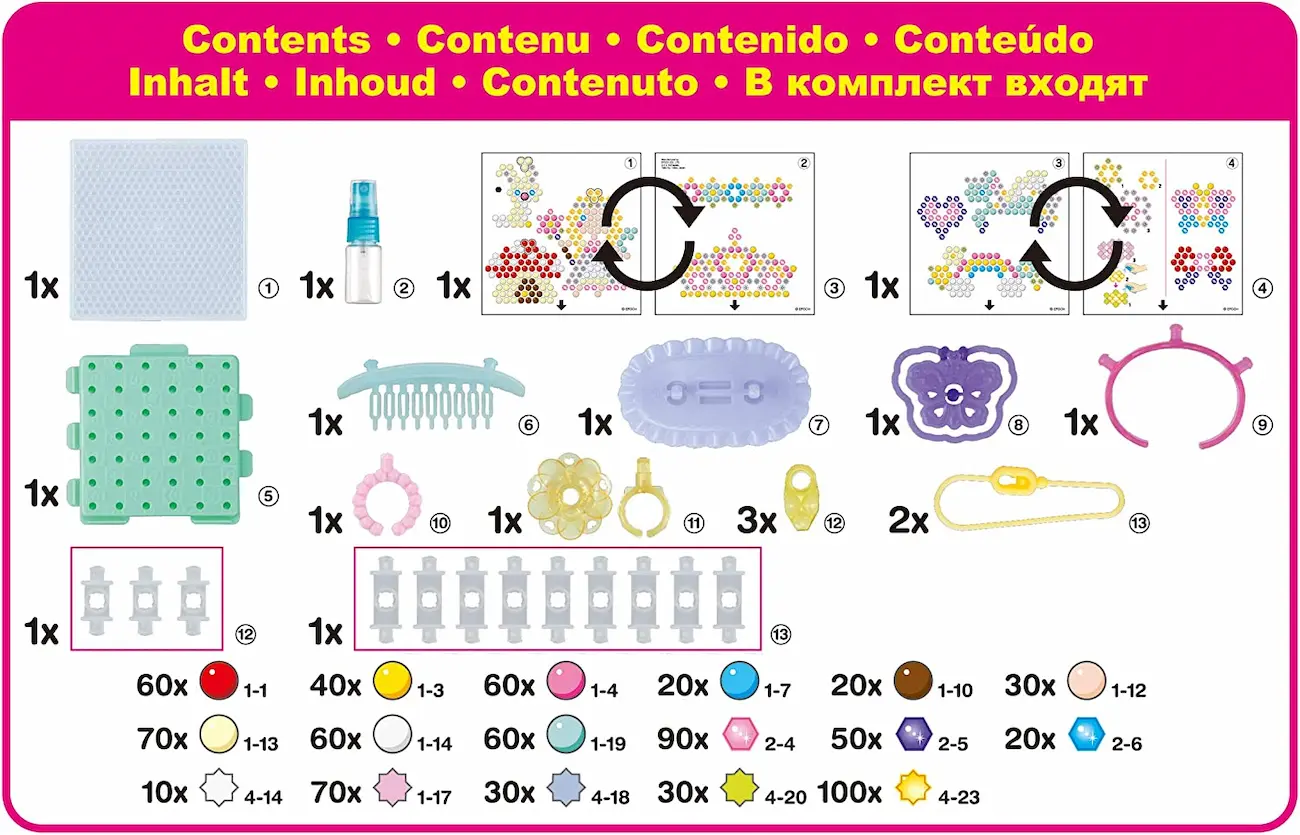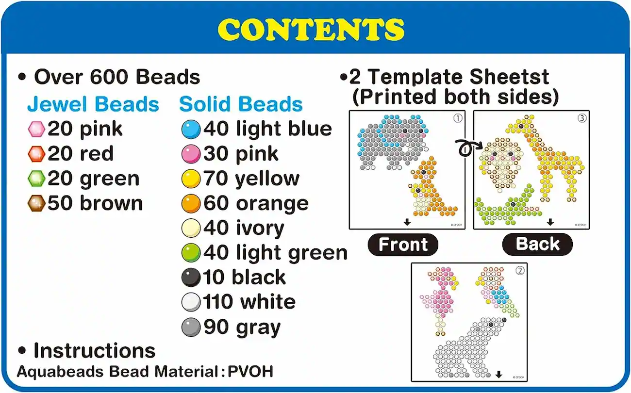 En la caja no solo encontrarás las cuentas, también incluye todo lo necesario para hacer figuras con Aquabeads: patrones, la base para trabajar, una espátula para quitar la creación, un rociador en spray para echar sobre las cuentas o, uno de sus accesorios más atractivos, correas, anillas e imanes para poder ponerlas con las figuras y llevarlas a dónde queráis.
